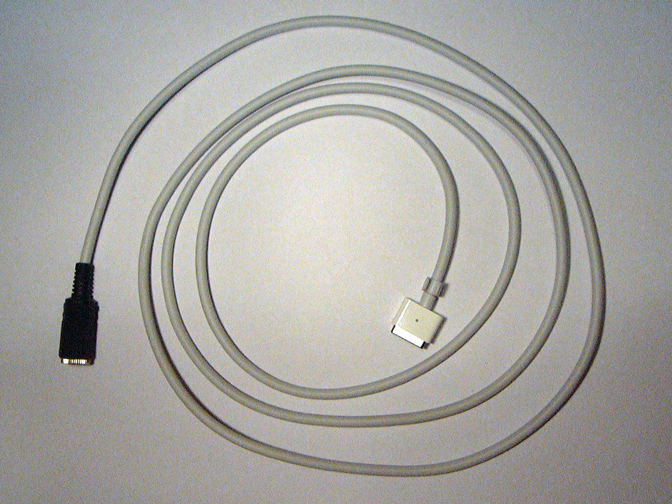 Using your cable Tips #3 and #4 (both included with your universal DC power adapter) will mate with the MagSafe cable you made. Tip #3 supplies 19.5 V while tip #4 supplies 16.5 V. Either will work, but using tip #3 may result in greater than desired power consumption. Use tip #4 if your battery is more than 71% charged; that mimics the behavior of the Apple power adapter. The battery in a MacBook Pro can be charged from empty with tip #4 even while the computer is being used; it just takes a lot longer. Use tip #4 if you have a MacBook (not a -Pro). The LED in the MagSafe connector will behave a little differently when your cable is plugged into a universal power adapter. The LED will continue to indicate red for charging and green for charge maintenance. When you unplug the MagSafe connector, however, it will stay illuminated in the same color. With the Apple AC power adapter, the LED turns off immediately after unplugging the MagSafe connector. Using your Apple power adapter Put the DC power plug on the Apple MagSafe AC power adapter (on the cable you cut earlier). Connect the center conductor to the center pin. Now you can continue to use your MagSafe cord with your existing AC adapter when you have an AC outlet available.