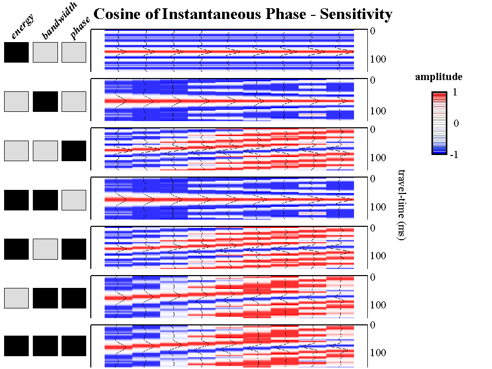 The cosine of instantaneous phase has the same uses as instantaneous phase with one additional benefit: it is continually smooth. By avoiding the +/-180 degree discontinuity that occurs with instantaneous phase, the cosine of instantaneous phase can be further processed (e.g., filtered and stacked) using conventional seismic processing tools. Amplitude peaks and troughs retain their position, but with strong and weak events now exhibiting equal strength.