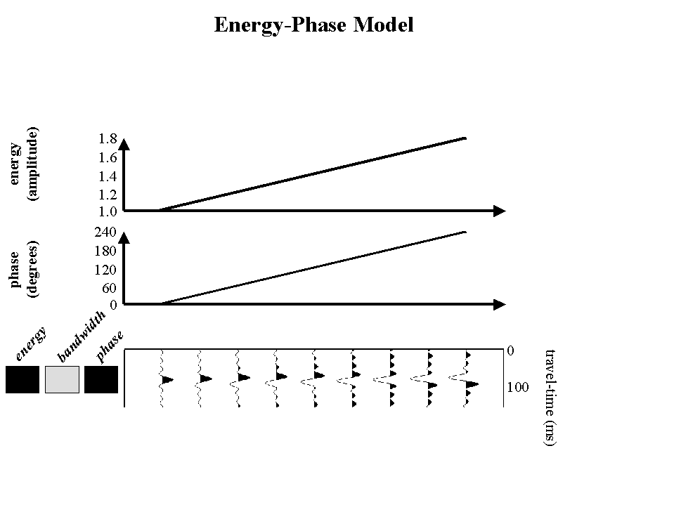 We will exploit two suites of models to help define and illustrate our seismic attributes. The first suite contains seven models that incorporate no tuning and show the effect of variable energy, bandwidth, and phase on a single reflectivity spike. Each model consists of nine traces 150ms in length; each trace has one reflectivity spike at 75ms. In other words, these seven models vary in the processing applied to one reflectivity spike: