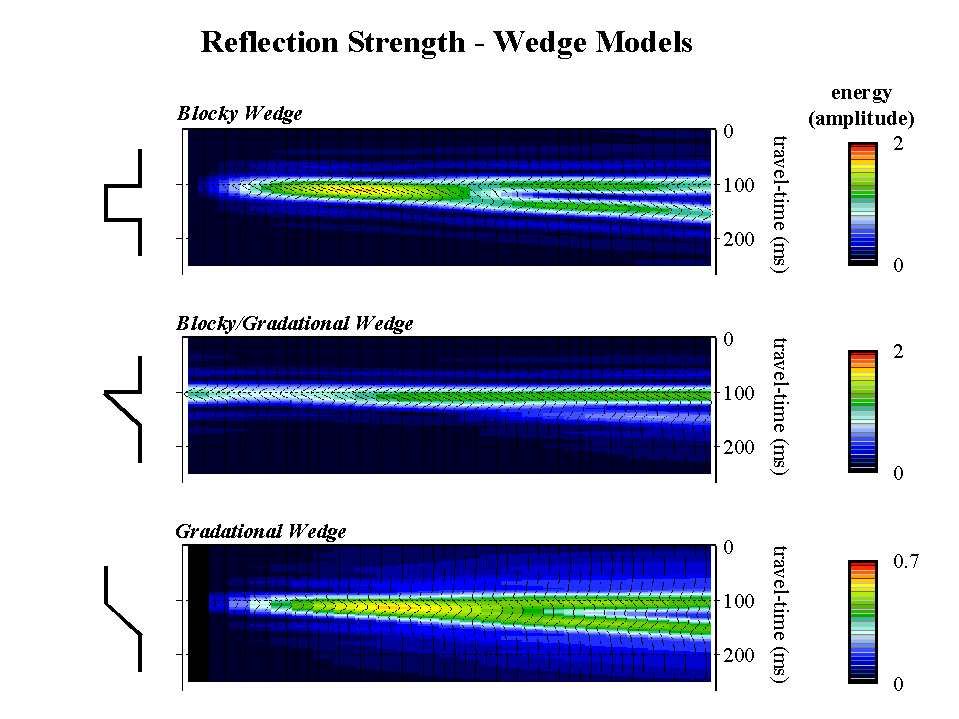 Blocky Wedge: Each trace contains two reflectivity spikes of equal amplitude, opposite sign. The top spike (amplitude = -1) is located at the top of the wedge. The bottom spike (amplitude = +1) is located at the bottom of the wedge.