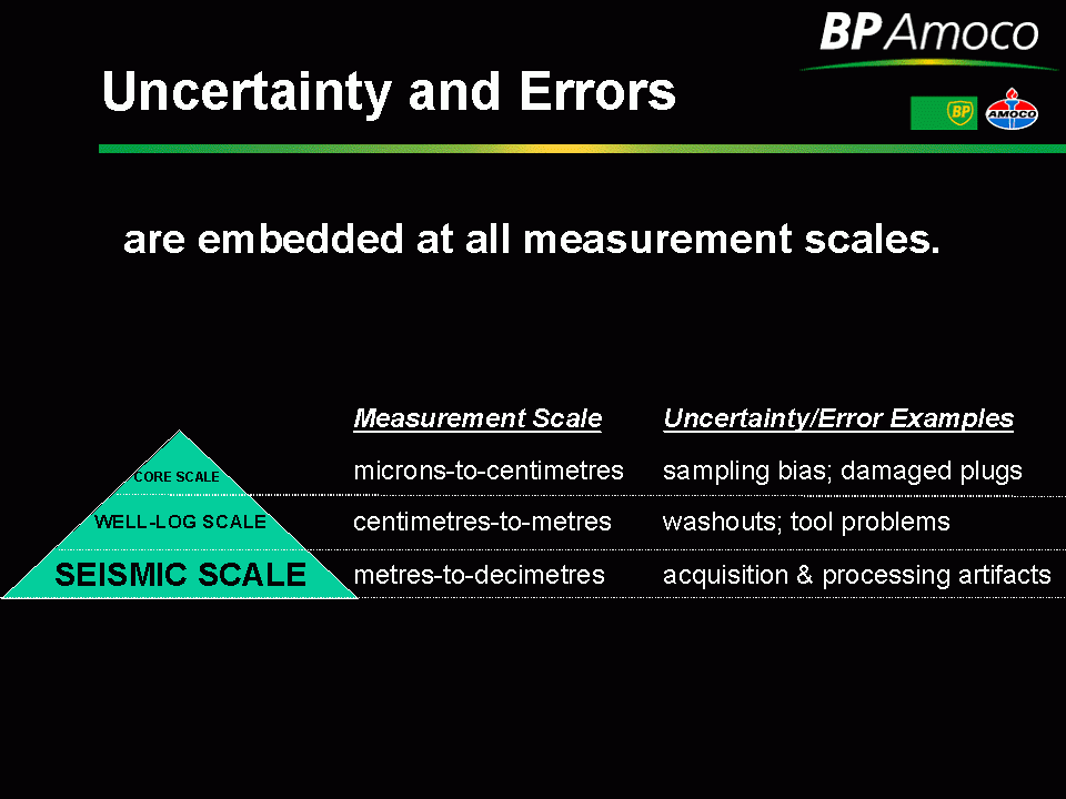 A great deal of uncertainty is imbedded in seismic-petrophysics calibrations because of large variations in scale of measurements. Core analyses provide information on the micron to centimetre scale; well-logs on the centimetre to metre scale, seismic on the metre to decimetre scale. In addition to these upscaling and downscaling issues, the individual datasets can contain errors such as: