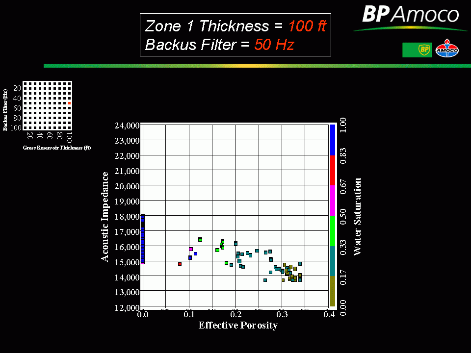 We recommend upscaling the acoustic measurements using a range of upper frequency cut-offs. This enables a sensitivity analysis of upper frequency versus petrophysical resolving power, for one particular flow-unit stacking pattern and thickness. Simply filtering a well-log interval with various hi-cut filters deals with only the frequency upscaling part of the sensitivity problem, and disregards the remaining three criteria of the upscaling sensitivity matrix (flow unit stacking pattern, thickness and velocity). Quantifying seismic resolution requires a sensitivity analysis with respect to all four criteria. In other words, Backus-averaging only one well-log-based zone of interest does not uniquely determine the resolving power of a particular seismic bandwidth with respect to petrophysical properties for all other thicknesses. It does so, only for the one particular vertical thickness and the one particular ordering of layers inherent in the well-log profile. If the thickness or stacking order of individual layers changes, the resolving power of the seismic bandwidth with respect to petrophysical properties will also change. For exampe, if you progressively decrease the wavelet bandwidth (i.e. hi-cut frequency), you also progressively decrease the resolving ability of impedance with respect to porosity. Note that by the time you cut-back the frequency to 30hz, the acoustic impedance-versus porosity relationship is relatively flat, indicating that it would be very difficult to quantify porosity variability in a 50ft bed using 30hz signal. There remains however, a contrast between porous-oil-filled sand and the shale, indicating that detection of porous sand (in a 50ft bed, using 30hz signal) is still possible. You can create a similar effect by maintaining the same bandwidth while progressively decreasing thickness. To assess the ability of bandlimited seismic to resolve the range of flow unit thicknesses and stacking patterns: