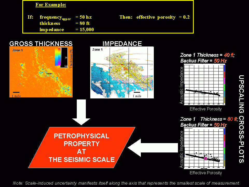 With well-log-scale data in hand from step #1, it is tempting to establish acoustic-petrophysical relationships at the well-log scale, then directly apply them to the acoustic impedance data derived from bandlimited seismic, and determine spatial variations in petrophysical properties. That approach however, does not address the scale differences between the two sets of data, and may provide erroneous reservoir characteristics. As we scale up (or bandlimit) the acoustic measurements, the acoustic resolving ability becomes a moving target that is dependent on four criteria: thickness, velocity, bandwidth and flow-unit stacking. The shape of the best line fit through the acoustic-petrophysics cross-plots changes with any change in the criteria. An acoustic impedance value can represent a range of possible petrophysical values (e.g. porosities) depending on local thickness, velocity or flow-unit stacking.