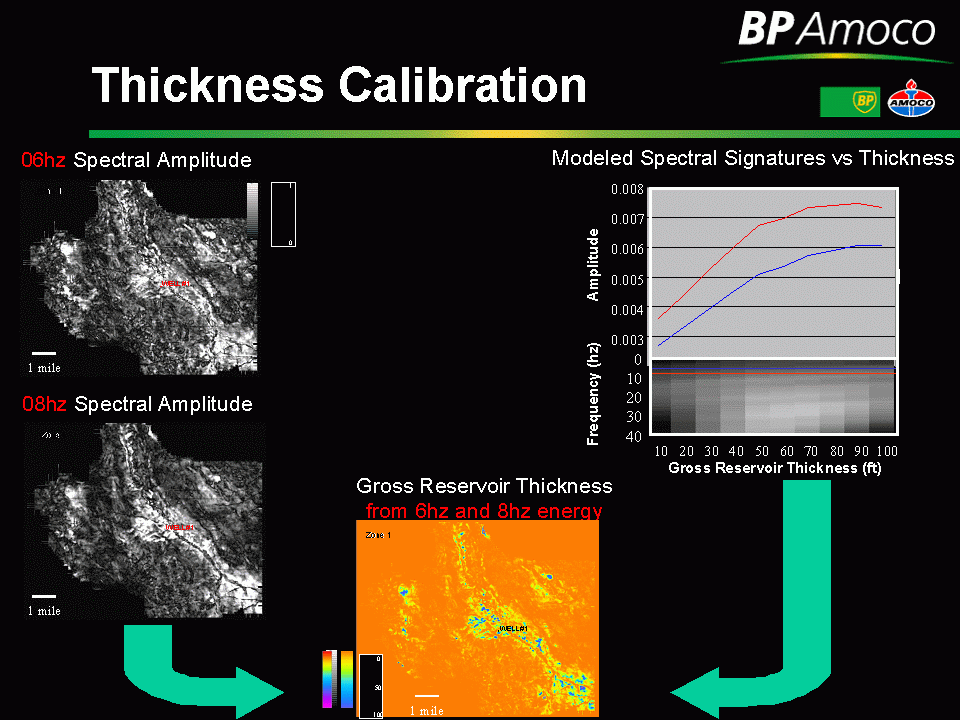 From the modeling you can determine the frequency below which the entire thickness range stays below resolution. Staying below resolution allows you to uniquely associate a thickness with each amplitude. If you cross-over to higher frequencies, part of the possible thickness range becomes resolved, and you will no longer be able to uniquely asociate a thickness with amplitude (i.e. the amplitude versus thickness relationship would turn over itself. So, proceeding with a low-frequency component enables less-subjective gross thickness estimation.