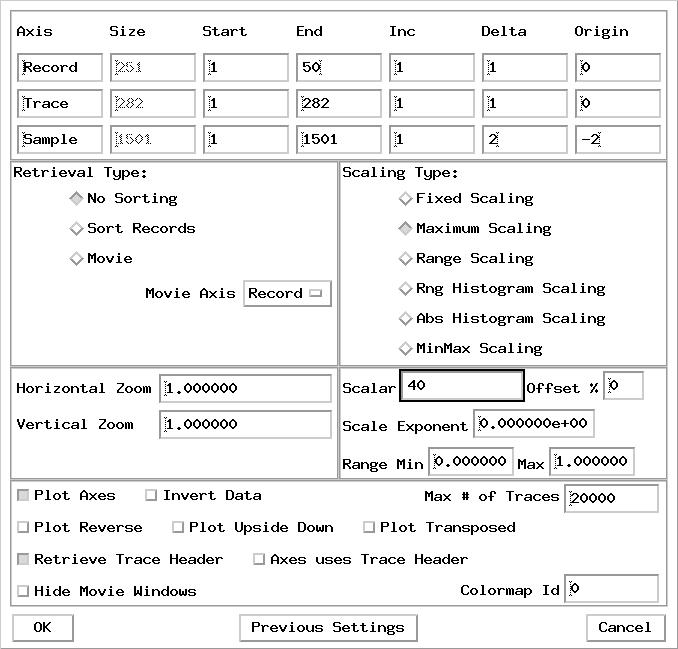 NumRec=251 NumTrc=284 SGRDat=0 PrRcNm=FieldRecNum PrTrNm=FieldTrcNumNote the syntactical differences. For purists, the DDS routines utilize a C structure look and feel. The USP routines skip all that and use a simple mnemonic relationship. Note also that in both cases I can affect the line header entries of NumRec and NumTrc by defining them in the mapping file. This particular SEG-Y file has an erroneous entry of 1 for the number of traces per record in the binary reel header. We could tell by our dump of the header structure and by our observation of the SEG-Y data in xsd earlier that the actual number of traces per record is 284, two auxillary traces followed by 282 data traces. Also note that these statements can be supplied in a mapping file or installed on the command line directly.