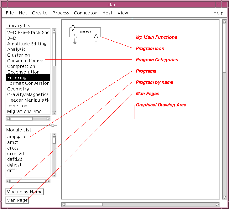 The top bar of the XIKP window has 6 basic functions: File, Net, Create, Process, Connector, Host, and View. These are stubs for popups which are either activated with the left mouse button, or by holding down the meta key (on either side of the space bar) and hitting the alphabetic character underlined (e.g. <meta>-f to activate the File popup).