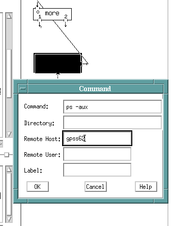 A Source box was selected and connected to one of the prebuilt nets called more (which really runs an xcat). The Source box menu is filled out with a ps -aux command (check the processes running) and with the remote machine name filled out. When this net is run (ctrl-R) successfully a scrollable xcat window will appear after a few seconds with the process information from the remote machine.