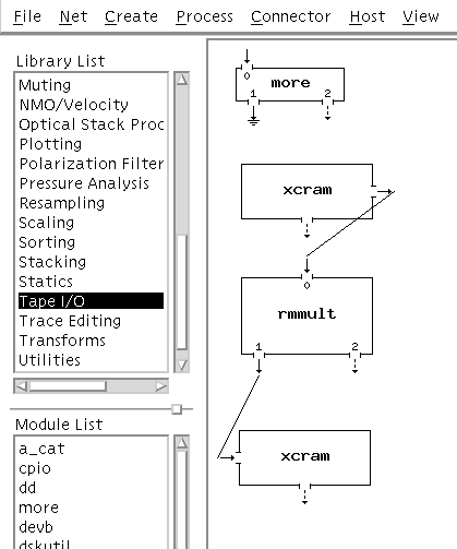 Let's suppose we want to build a net to read data from tape, do an rmmult, and write the results to tape. For this net we'll need a Source process, a USP process, and a Sink process. The Source and Sink we get from the Create menu stub at the top of the main XIKP panel; the rmmult process we get by first selecting (double left click) "Multiple Attenuation: transform methods" from the Library List (it also helps to have your favourite web browser running to quickly scan the functional man page listings in USP) and then selecting "rmmult". When the "angle iron" is in the position you want left click to drop the rmmult box finally yielding: