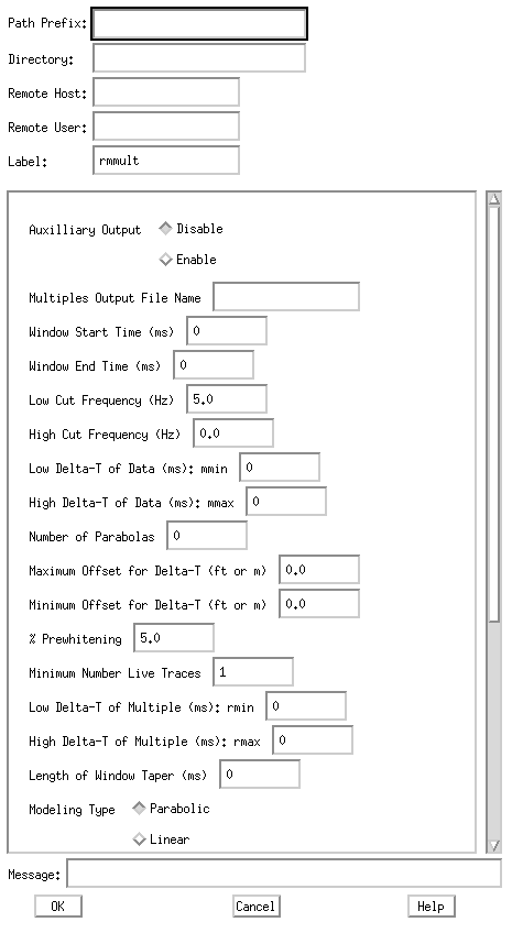 Click and bring up the menu panels for the splitr and merge process boxes. Their default states are to do rotary distribution of seismic records (i.e. gathers with more than a single trace). If any process in the parallel arms is a record-type process (i.e. requires a whole gather like rmmult) then the splitr panel should be toggled to rotary record mode and the merge panel should be toggled to gather in records back-to-back. If all process in the parallel arms are single trace processes (e.g. pred, filt) then the splitr panel must be toggled to rotary traces and the merge toggled to multiplex traces and clcik Yes to restore original number of traces/record. Failure to observe these rules could result in bad performance characteristics for the parallel nets. The majority of nets will probably be of the rotary record type since record-type processes are usually more compute intensive and can benefit more from parallelization.