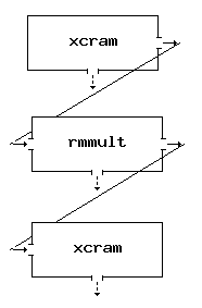 The Source and Sink box menus are filled out with the proper commands as discussed in the examples above. In addition the "Label" entry has been filled out to properly identify the box. Using the middle mouse button click in the sensitive zone of the "xcram -r" output connector then do the same for the "rmmult" input connector. Repeat for the "rmmult" to "xcram" connection.