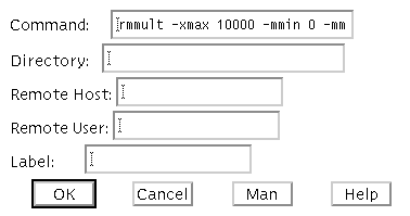 In the Command area is the rmmult command line with all the desird command line arguments.. It wraps out of view but you can move forward or back using your arrow keys. The Directory area contains the location of the printout files. In this case it is left blank. The default printout file location is the current valid directory which can be obtained from the File menu in the main XIKP menu selection. The Remote Host and Label areas have also been left blank. If you wished to execute this node on a specific machine you would indicate the machine name in the Remote Host entry. Anything you enter in the Label area will appear on the icon in the graphical net representation.