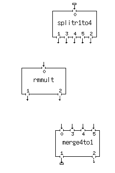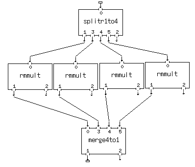 A single rmmult process box has been dropped. We will fill out its menu panel in entirety including the remote host and full path to the printout directory as well as the rmmult parameters themselves. Then we will use the Process Copy (C key) to duplicate this process box 3 times. We then look at the three other menu panels. They will be identical to the first one we filled out. The only change to make is the Remote Host entry in the header portion of the menus. This done we connect the sockets as shown (here we have not used the load balancing feature and have forced each remote process to run on a particular machine):