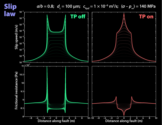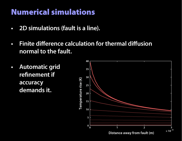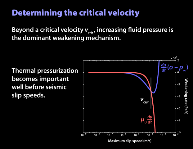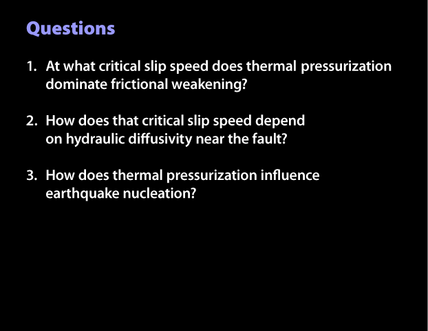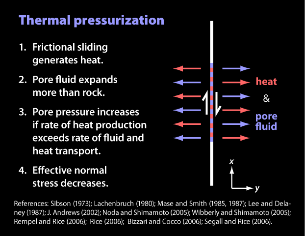 For those of you who are just now joining the session, here's a brief description of thermal pressurization. Friction on a sliding fault generates heat, causing pore fluid to expand. If the rate of heat production causes a pressure build-up that can't be outpaced by diffusion, effective normal stress decreases, weakening the fault.