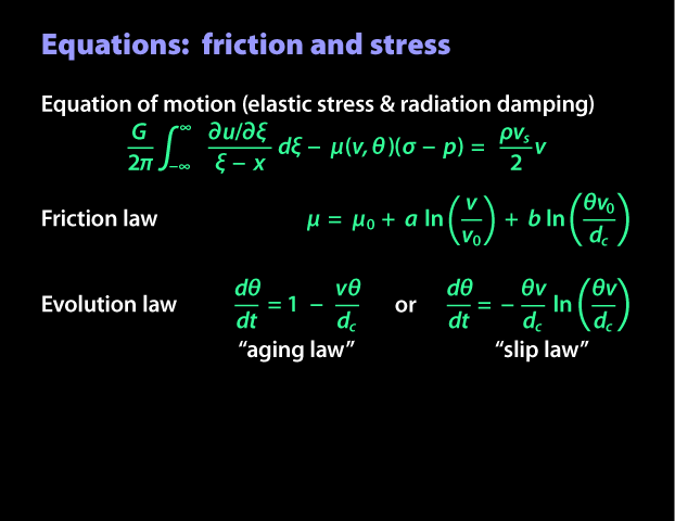 The first one is our equation of motion. It is, simply, stress minus frictional weakening equals radiation damping.