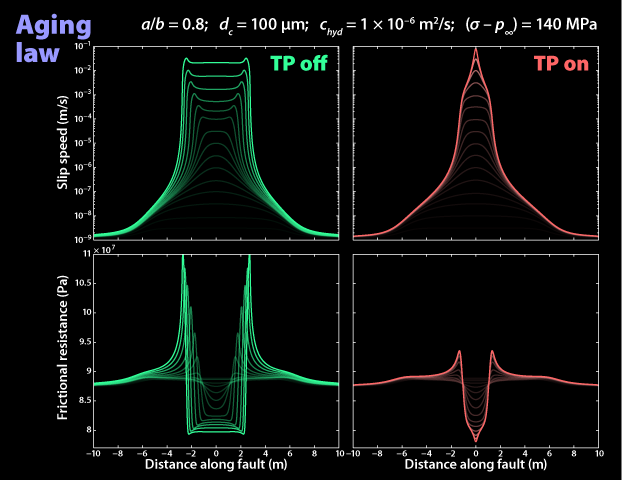 And just like with the aging law, the slip profile with thermal pressurization on shows that it follows the same track up to a critical velocity.