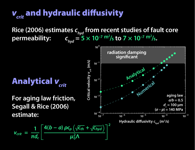 There are two things I want to cover in this slide. First is the relationship of critical velocity and hydraulic diffusivity. Jim Rice tabulated permeability data from some studies of fault core rocks and calculated a diffusivity. He found a rather constrained range of values, but given the wide range of rock permeabilities, we wanted to study the effect of thermal pressurization over a wider range. In this case, 10-7 m2/s up to 10-3 m2/s.