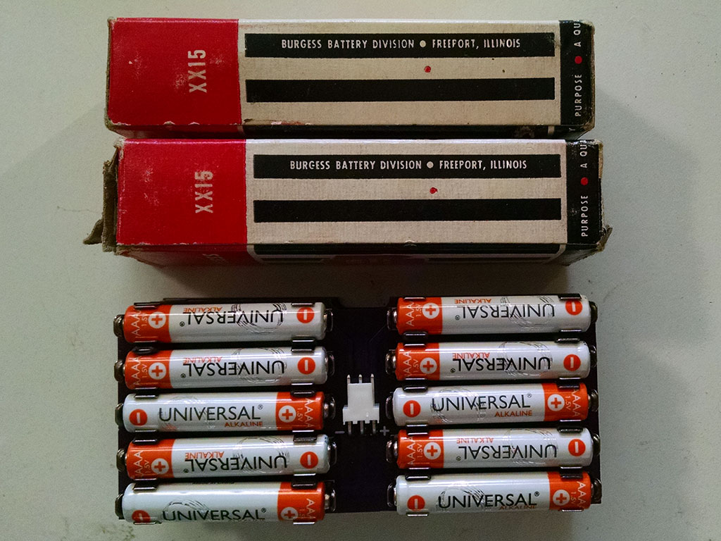 The Triplett 631 is a vintage analog multimeter with a vacuum tube voltmeter. That is, in some operation modes, the analog meter is driven by a vacuum tube circuit, allowing for a high input impedance (11 MΩ) compared to the impedance of the panel meter’s electrical movement. In the 631’s original design, the plate voltage for the 1R5 vacuum tube is 45 V, supplied by two 22.5 V “XX15” carbon-zinc batteries made by the Burgess Battery Company. These batteries (or the equivalent Eveready 425-P) haven’t been available for decades, so I designed a replacement using AAAA cells mounted on custom printed circuit boards (PCBs).